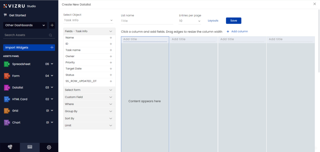 - Select the source spreadsheet from the dropdown list, enter a suitable title for your datalist, and choose the number of Entries per page, which sets the number of rows to be displayed in the datalist. The fields of the selected spreadsheet are displayed in the left pane.