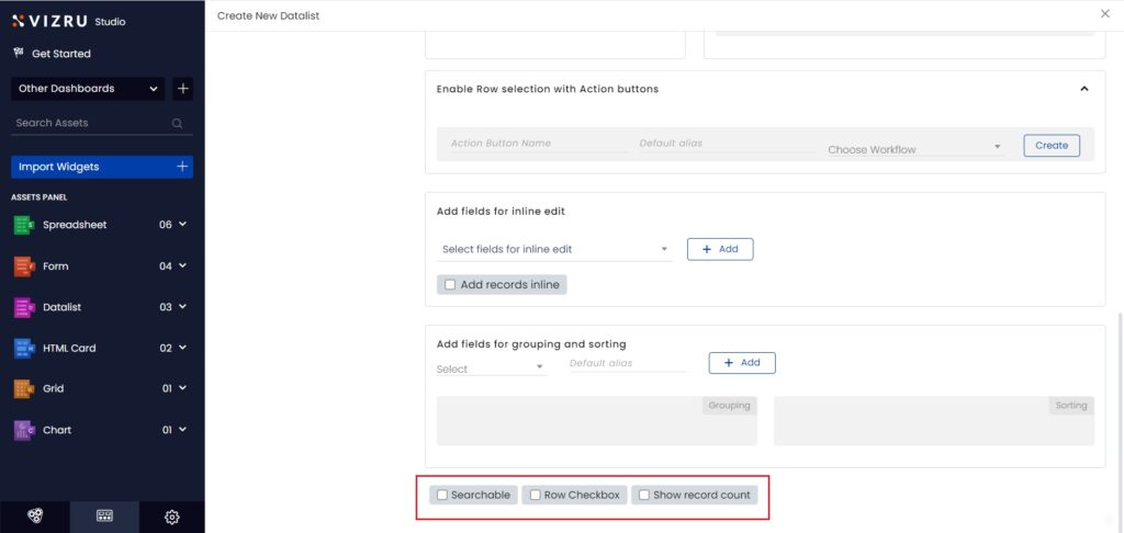 - You can choose to enable or disable search within your datalist and also opt for checkboxes for every row. For this, select the checkboxes for “Searchable” and “Row Checkbox”. To display the count of records in the datalist, select the checkbox for “Show record count”.