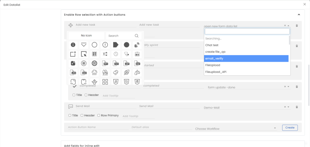 - Give a name to the action button, choose an icon, give alias name for the button, select the appropriate workflow from the dropdown list, and click Create.