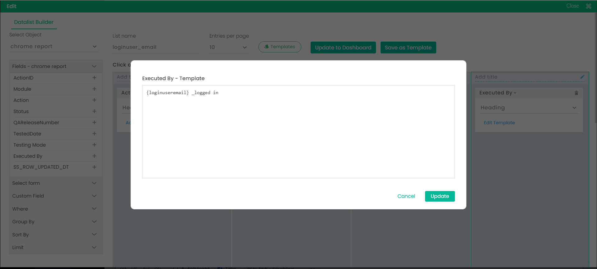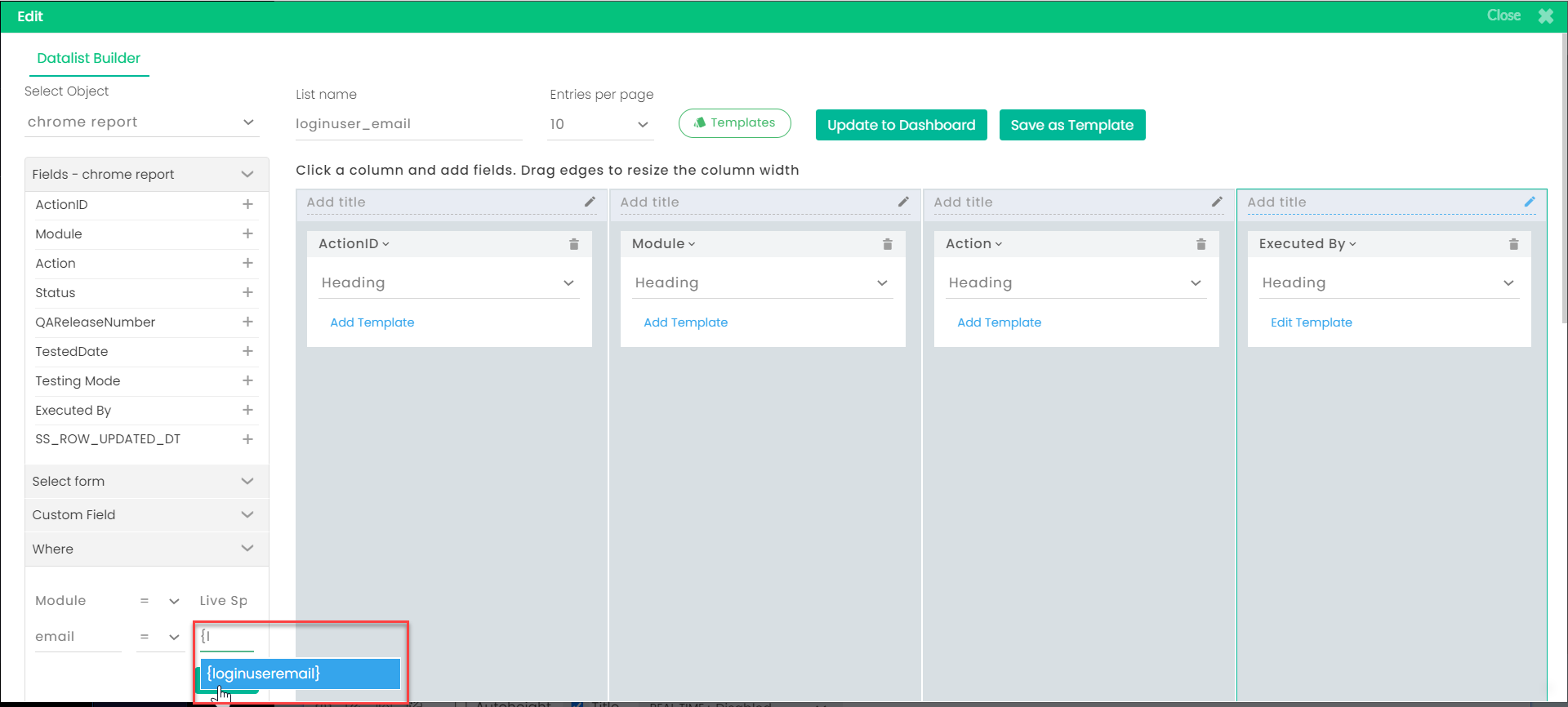 - Login user email on datalist: You can get the details of the login user in a datalist by adding a template {loginuseremail} to the field or by adding a filter for the email with {loginuseremail}. This feature helps to get the details of the users logged into the specific datalist.