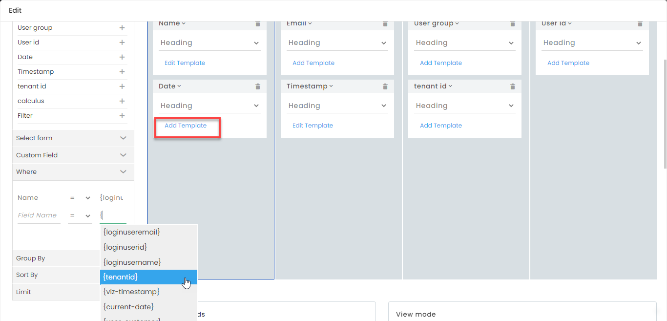 - Workflow custom functions in datalist: You can add workflow custom functions to datalist. You can add them either using Add Template below the field or using the option Where in the left panel.